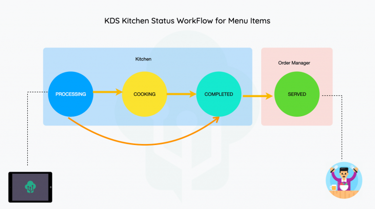 | Cooking     | Show items on the screen that are being cooked. This step can be skipped however it comes very handy for a chain work. For example, once a Pizza Topping Screen Manager dresses a Pizza and puts it in the oven, it will press the Green button and item status will turn to ‘Cooking’ and will be displayed on KDS Screen where Kitchen Status was set to ‘Cooking’. |