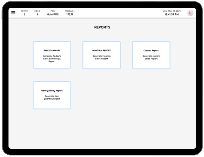 FoodBucket provides four types of reports that can be generated from the Point of Sale (POS) system. These reports include Sale Summary, Monthly Report, Custom Report, and Quantity Report.